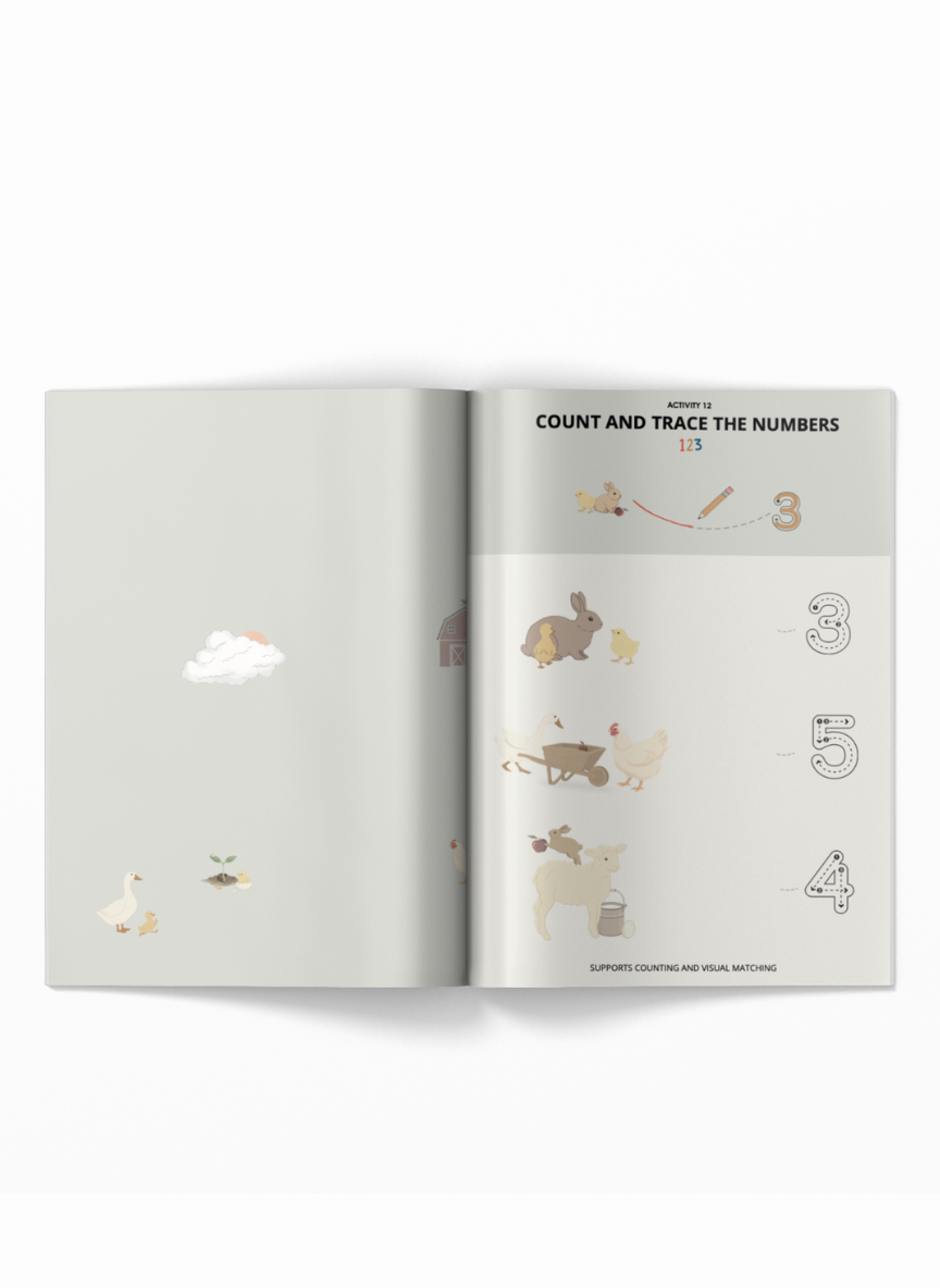 This farm animals educational workbook for 3–4 year olds uses calm, screen-free activities to build early focus, counting, and visual reasoning through familiar farm scenes. Designed for preschool minds, it supports independent start and quiet learning without overstimulation.